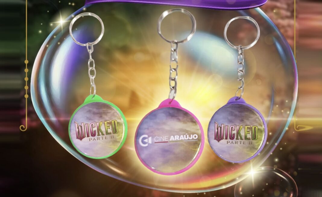 O Cine Araújo vai além da tradicional sessão de cinema. Assim, a estreia de “Wicked: Parte II” se transforma em uma experiência inesquecível para os fãs. A partir de 19 de novembro de 2025, quem assistir ao filme poderá levar para casa um chaveiro exclusivo inspirado no universo mágico de Oz. Ele ainda estará disponível em três cores: roxo, verde e rosa.