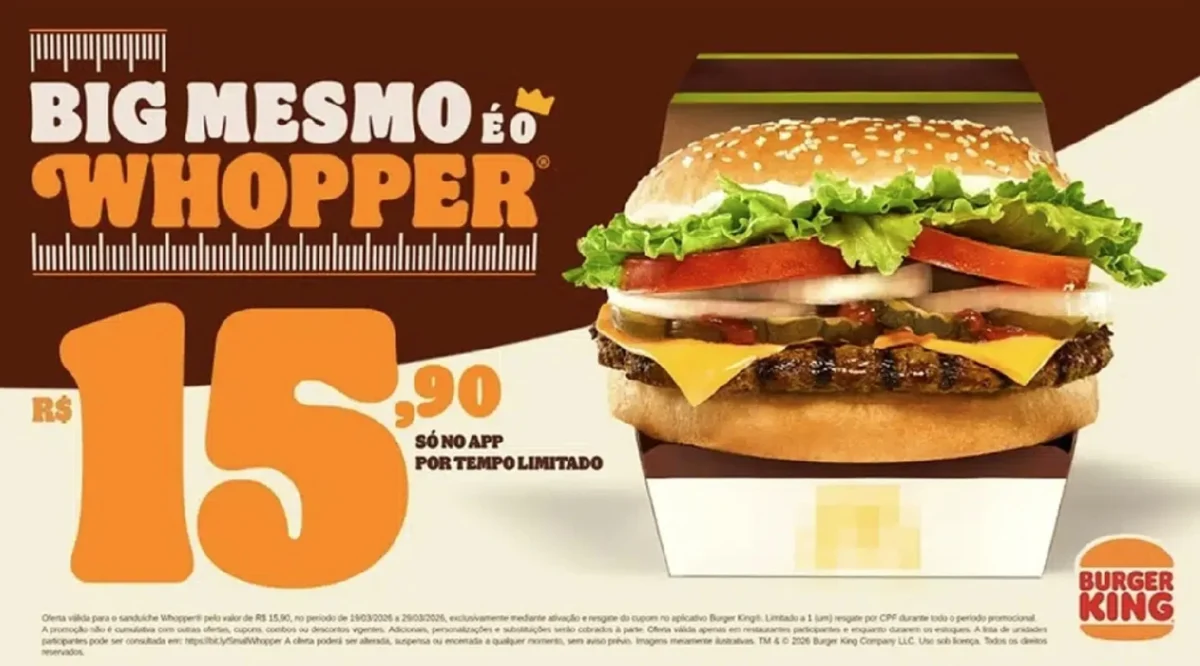 Na prática, a utilidade para o consumidor está na mecânica da oferta. O valor promocional do Whopper pode ser ativado via cupom dentro do aplicativo oficial da rede, com uso permitido em diferentes canais de compra, como balcão, totens, drive-thru e retirada. A condição é simples: um resgate por CPF, válido até 29 de março ou enquanto houver disponibilidade.