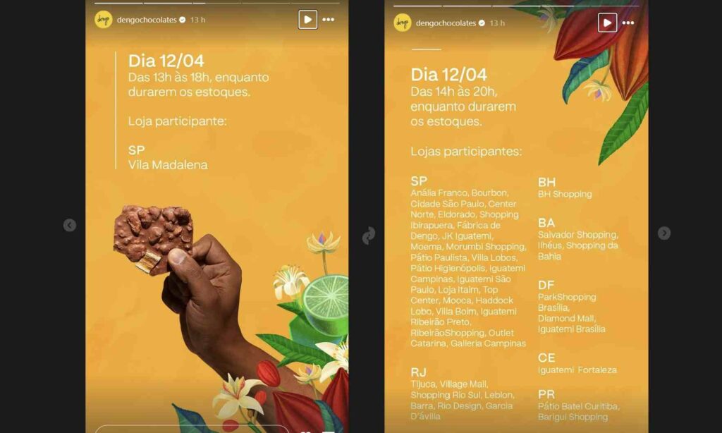 O anúncio está sendo veiculado nos stories do Instagram oficial da Dengo Chocolates. Se você deseja participar da ação, dirija-se a um dos endereços participantes e fique atento aos horários em que ela acontecerá. Portanto, confira abaixo na imagem os locais, a ação é válida enquanto durarem os estoques: