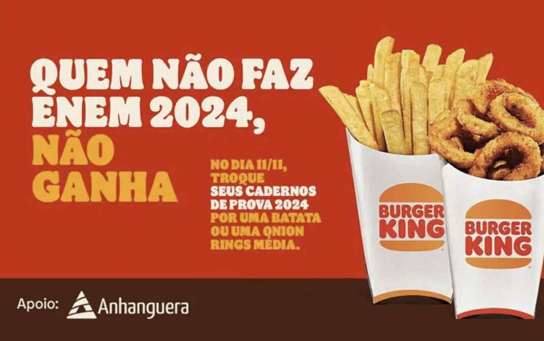 Finalmente, os humilhados serão exaltados! Nesta quinta-feira, 5 de novembro, o Burger King anunciou uma parceria com a Faculdade Anhanguera que promete agradar os estudantes que vão prestar o ENEM 2024. A colaboração, divulgada através do Instagram, traz uma surpresa especial: todos os candidatos que comparecerem a um restaurante do Burger King com o caderno de prova do ENEM terão direito a uma batata frita média ou uma porção de onion rings média grátis.