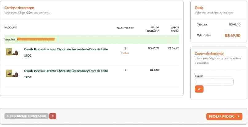 O voucher é adicionado automaticamente no carrinho e o valor final é aplicado apenas a um dos produtos selecionados. Ou seja, finalize seu pedido concluindo a transação utilizando seu cartão Mastercard.