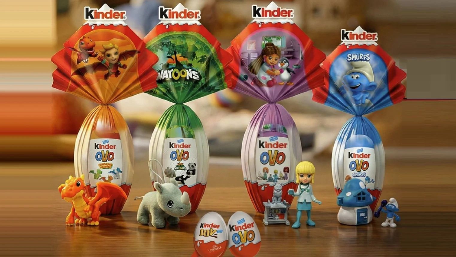Além das licenças conhecidas, a marca também desenvolveu coleções próprias com temáticas de fantasia e aprendizado, como “Mundo dos Dragões”, “Mundo da Veterinária” e “Natoons”, inspirada em animais. Os brinquedos aparecem tanto no tradicional Kinder Ovo quanto em ovos de Páscoa maiores, com diferentes combinações de surpresas colecionáveis.