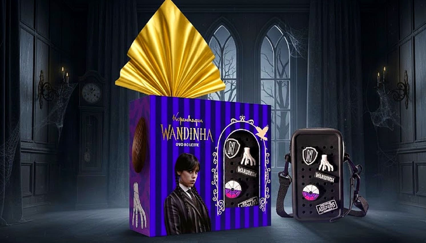 Ao abrir o ovo, o consumidor encontra não apenas o chocolate premium da marca, mas também uma bolsinha temática em estilo gótico e cinco pins exclusivos que remetem à estética e aos símbolos da Wandinha.