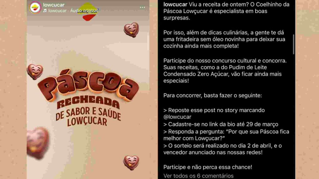 Para concorrer é bem simples, basta com seu perfil no Instagram repostar o post no story marcando a marca, realizar o seu cadastro no link da campanha até o dia 29 de março e responder a seguinte pergunta: “Por que sua Páscoa fica melhor com Lowçucar?”.
