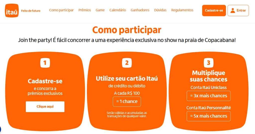 Para participar do sorteio de ingressos, é necessário realizar uma inscrição na página da promoção. A cada R$100 em compras feitas com cartões de débito e crédito do Itaú, os participantes terão a oportunidade de se envolver em uma atividade interativa para concorrer aos pares de ingressos, além de receber um número da sorte para o sorteio da “experiência completa”.