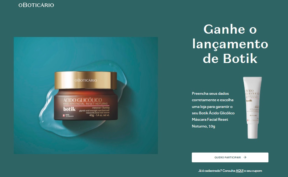 O Boticário voltou a distribuir brindes grátis aos seus consumidores para a nossa alegria, a campanha está sendo um sucesso e muitos leitores já estão indo até as lojas da marca espalhadas por todo Brasil resgatar gratuitamente uma Máscara Facial Reset Noturno Ácido Glicólico Botik. Para quem ainda não conhece os produtos da linha Botik aliam tecnologia Suíça a ativos de alta performance para potencializar resultados eficazes e visíveis para a sua pele.