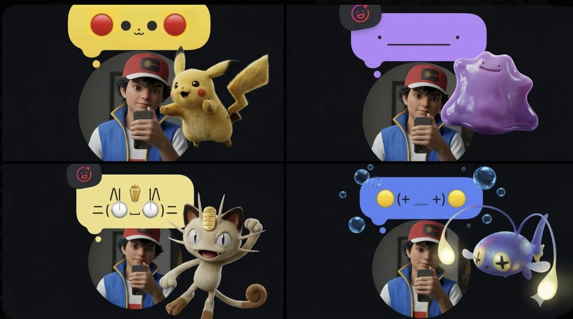 Quando esses elementos são organizados visualmente, eles formam expressões que lembram criaturas populares do universo Pokémon.