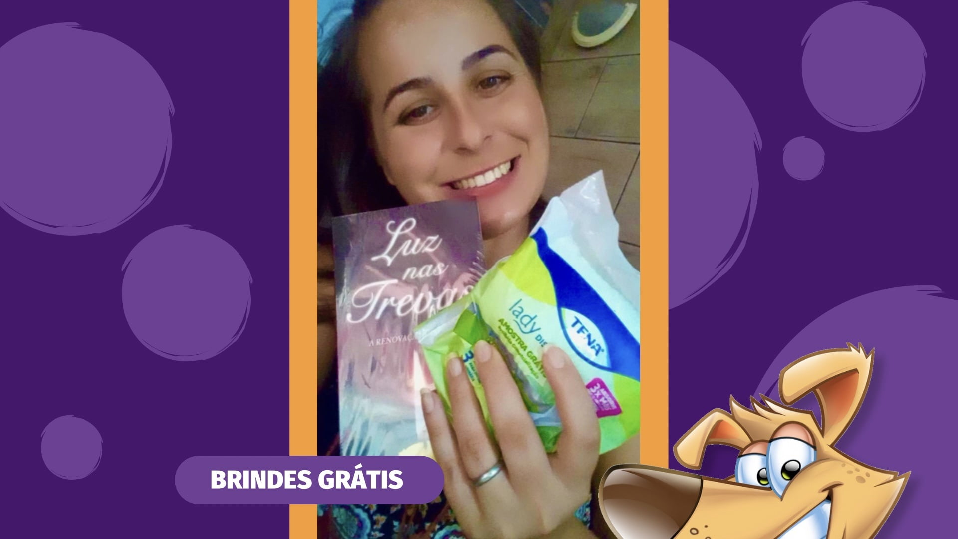 A leitora Erotilde Lopes compartilhou com a gente a sua foto segurando alguns brindes que recebeu, foram eles: Amostras de Absorvente Tena Lady Discreet um protetor diário para mulheres, específico para incontinência urinária leve. Este produto possui uma dupla camada de absorção que garante segurança para que o dia possa ser desfrutado com toda a confiança. Além disso, ela também recebeu o Livro Luz nas Trevas, que fala um pouco sobre estar aberto a Deus e procura mostrar a você que a abertura emocional de nossa vida não é um ato físico como abrir a palma de sua mão, mas sim um ato muito real, que se baseia em uma decisão pessoal. Ambos os brindes ainda estão disponíveis para você solicitar.