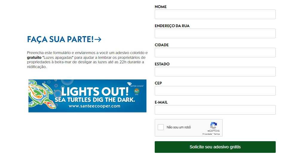 Os interessados em solicitar este brinde basta preencher o formulário, com seus dados de envio. Você vai receber um adesivo colorido e gratuito “Luzes apagadas” para ajudar a lembrar as pessoas que na beira-mar as luzes devem ser apagadas no momento da desova.
